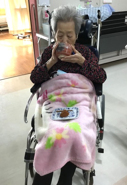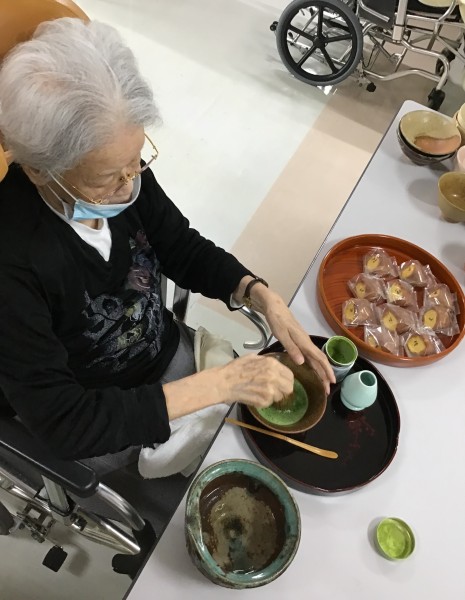 丁寧にお茶を点ててくださり、参加されたご利用者や職員は「美味しく頂きました」と心温まる幸せな時間に包まれました。