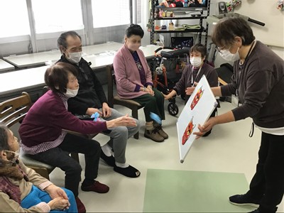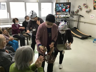 「福豆お菓子」を干支のご利用者から、皆さんお一人ずつに手渡しして頂き節分の福をお届け。