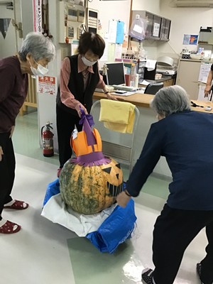 かぼちゃの大きさを見て「え~!こりゃ、すごいな~!」「本物かえ~」「顔があるが!」「帽子もかわいいなぁ」と、様々に歓声が上がりました。さて、肝心の重量を目視で予測。「おぉ~い、かぼちゃさん。何キロあるんだい。」と顔を近づけて見られ、隣の方も「何キロあるの?」と次々と覗き込まれます。「○○キロだわ」「いや~、もっとだろう」「え~、〇〇キロぐらいだでー」など、会話も弾み大盛り上がり。