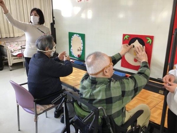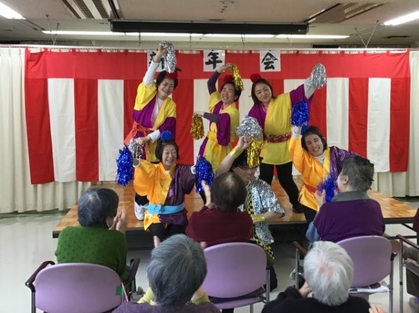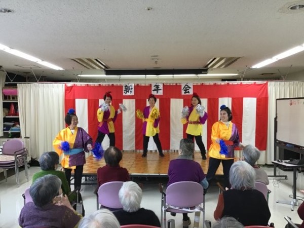 1日目は職員の踊りと福笑い、ボランティアの方に来ていただきお茶会を行いまし