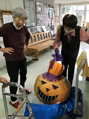 かぼちゃの大きさを見て「え~!こりゃ、すごいな~!」「本物かえ~」「顔があるが!」「帽子もかわいいなぁ」と、様々に歓声が上がりました。さて、肝心の重量を目視で予測。「おぉ~い、かぼちゃさん。何キロあるんだい。」と顔を近づけて見られ、隣の方も「何キロあるの?」と次々と覗き込まれます。「○○キロだわ」「いや~、もっとだろう」「え~、〇〇キロぐらいだでー」など、会話も弾み大盛り上がり。