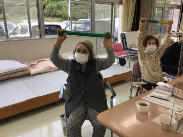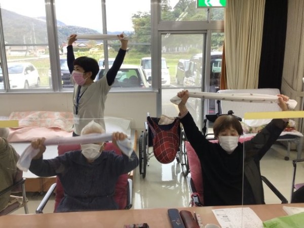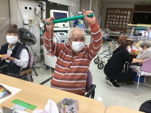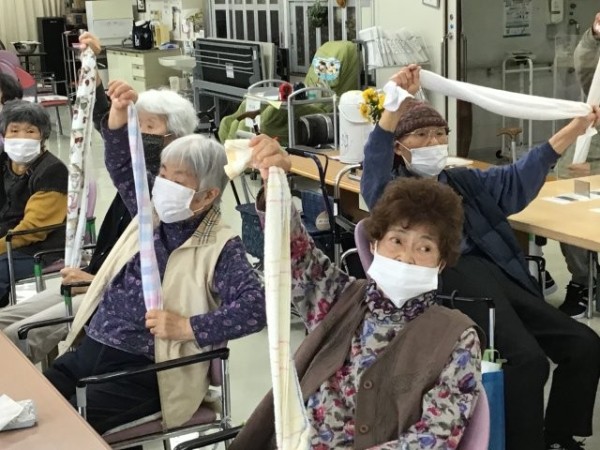 デイサービスのご利用者は寒さに負けないよう、棒やタオルを使って色々な体操に取り組んでおられます。