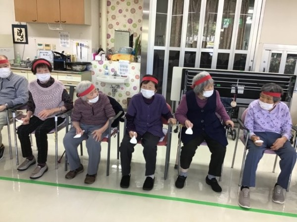 お手玉送りは、お手玉を落とさないようにしゃもじで隣の方に送り、最後は職員が受け取って