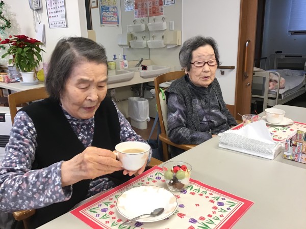 おやつは職員お手製のパフェ。「かわいい」「おいしいわ」と好評でした。