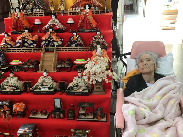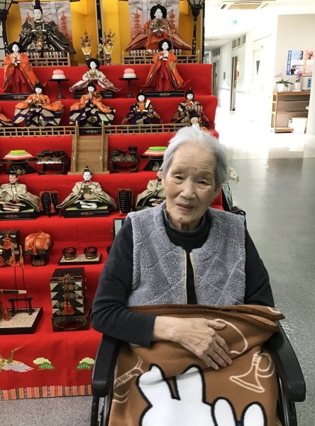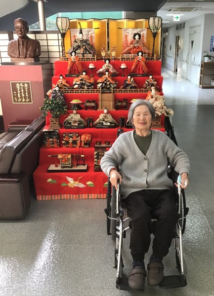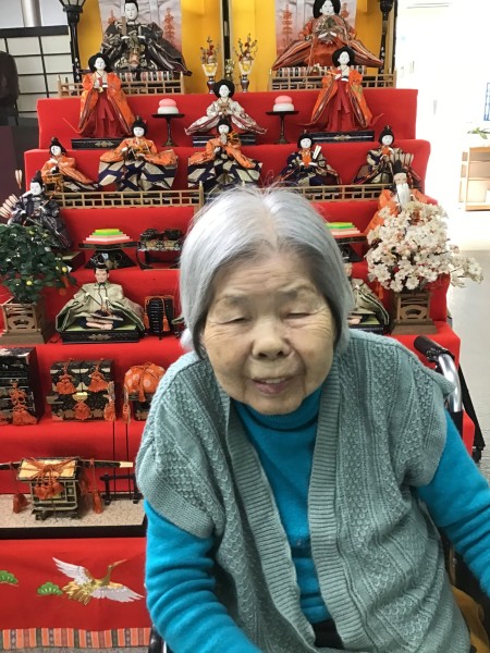 三喜苑玄関前にて、お雛様と記念撮影。