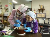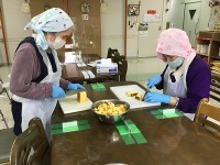 カステラをサイコロに切り、ホイップクリームで飾り付け。仲良く手際よくがモットーのケアハウス三喜苑...